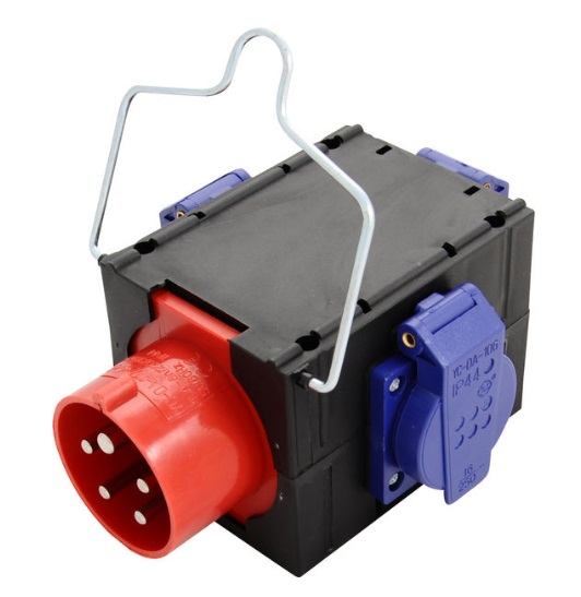 16A Distro – Compact power splitter that converts a 16A three-phase input into three separate Schuko outputs, one per phase. Simple, durable, and ideal for small event setups or quick power distribution on stage.